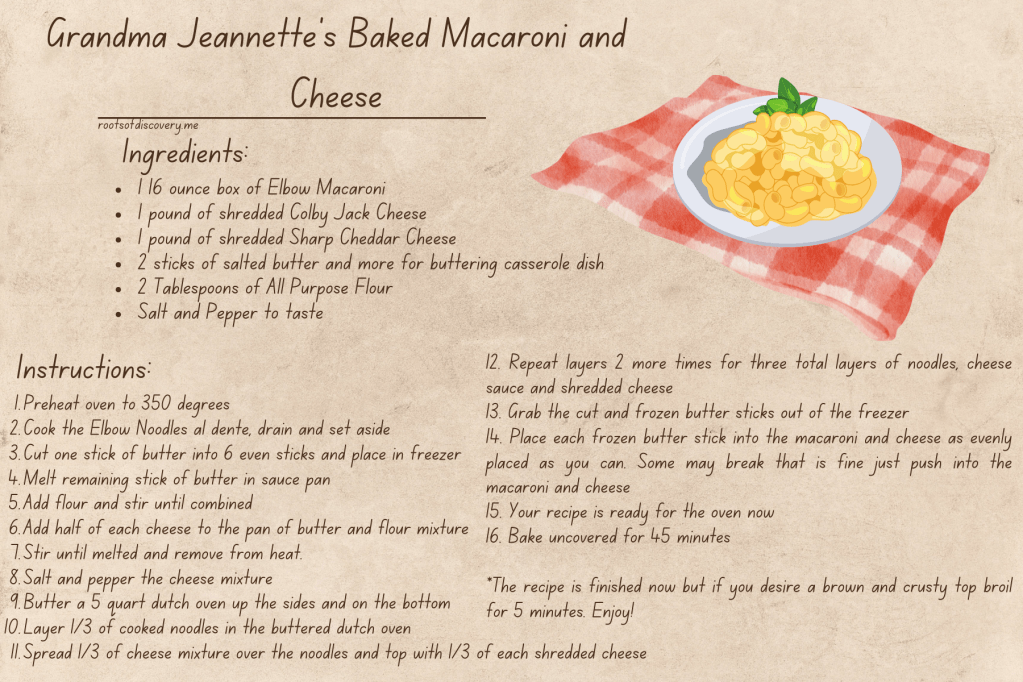 Our Grandma Jeannette died when we were young so we never experienced cooking with her. It wasn’t until I was a young adult that my dad, her oldest son, asked me to try and perfect her Baked Macaroni and Cheese recipe.