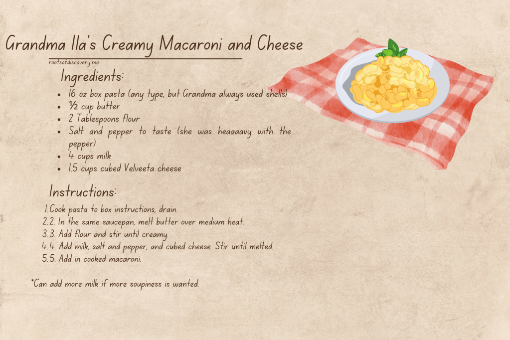 When I make this soupy Macaroni and cheese, or even when I think about it, I am transported back into my Grandma Ila’s kitchen.