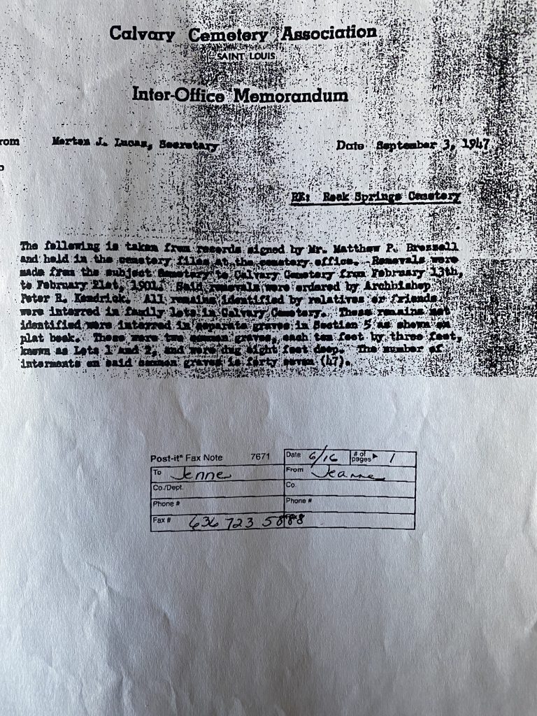 We searched for when the two metal containers were exhumed and moved again. Then again. You guessed it, again! The last cemetery had this memo from 1947 explaining the removal from Rock Springs Cemetery and where they ended up.