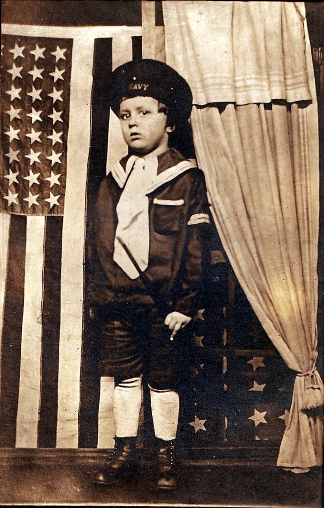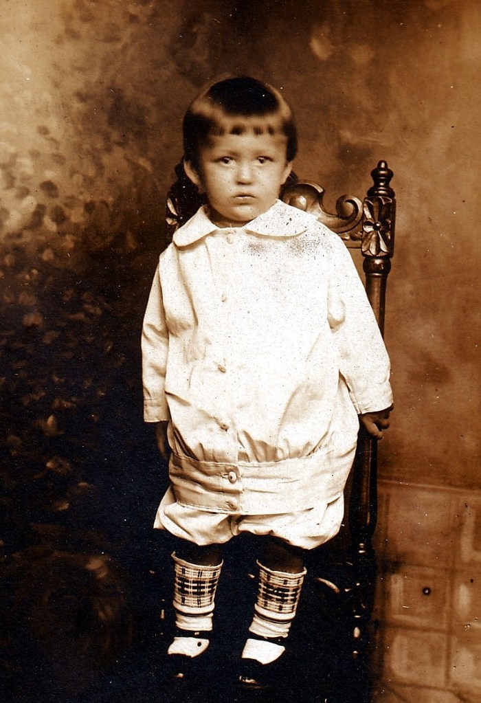 In the image above, Walter Jr is wearing typical fashion for young boys at the time. He is wearing white collared knickers, blooming short pants, high socks and dress shoes. He looks to be leaning against a faux or folding chair. His unimpressed expression is adorable.