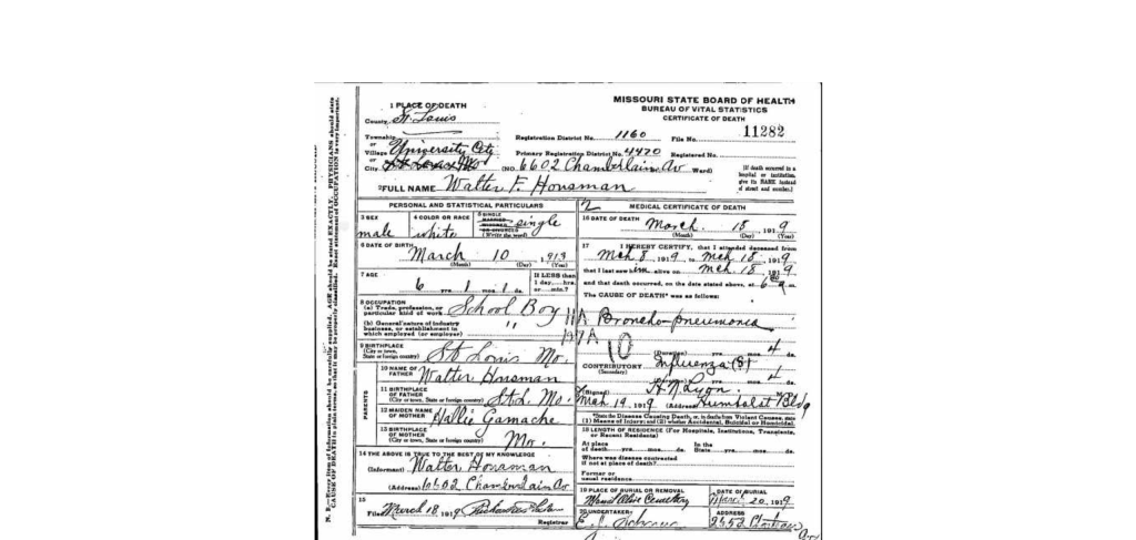 St. Louis, Missouri was battered by several influenza surges. Walter Jr fell victim in Missouri’s third wave.