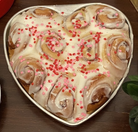 My childhood Valentines Day traditions as a young girl was to pass Valentines Day cards out to my classroom of friends and receive a Whitman’s Sampler box of chocolates from my parents. I continued the tradition of getting my daughters the same chocolate on Valentine’s Day. In the morning I make a batch of cinnamon rolls in a heart shaped pan. Recently, I found the same heart pan on Etsy so I can share a pan of cinnamon rolls with others. Our Valentine’s Day cinnamon rolls tradition is a family favorite!