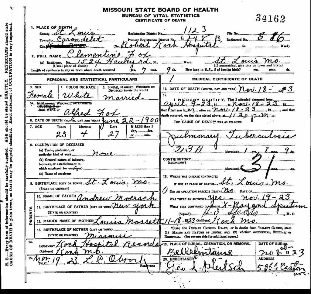 Clementine was born to Louisa Mossett and Andrew Moersch in the year 1900 in St. Louis, MO. She was the youngest sibling to my great grandma and is my Great Grandaunt. Combing through albums I came across a picture of her. Luckily, this picture was labeled! She is a young, maybe 12 or 13, in the picture. Clementine married Alfred M. Fox in December of 1917. She died some short years later at the age of 23. She passed away from Pulmonary Tuberculosis after suffering from it for over a year.