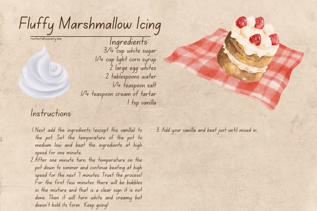 I love how the ingredient list for this icing recipe is simple and within minutes you have a pot full of delicious marshmallow fluff. Easy and delicious. What more could one want? The history of marshmallow fluff dates back to 1917 and is quite interesting as documented here! Check out the recipe page for more ideas of what could be done with my grandmas recipe.