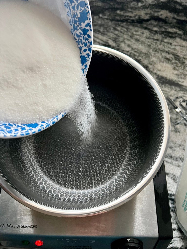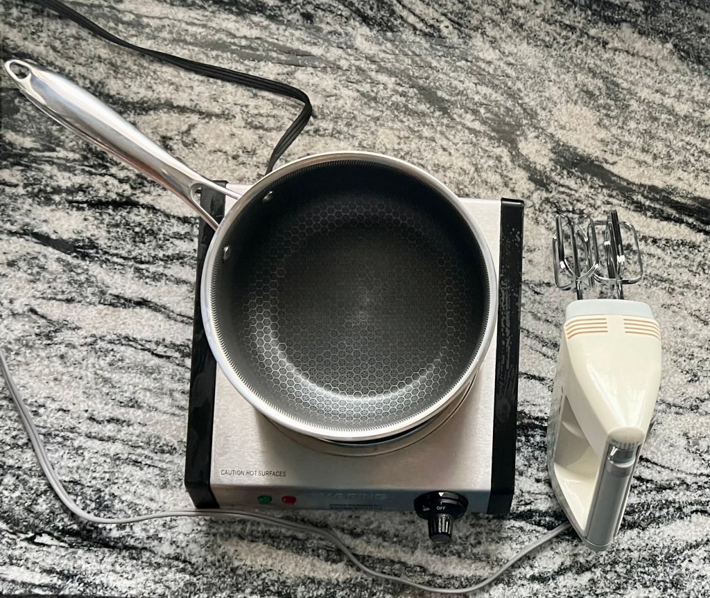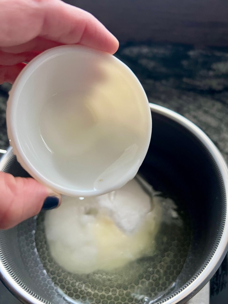 Next add the ingredients (except the vanilla) to the pot. Set the temperature of the pot to medium low and beat the ingredients at high speed for one minute