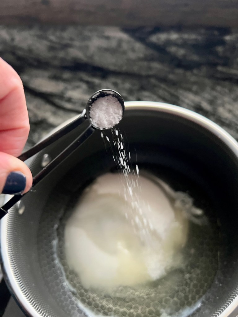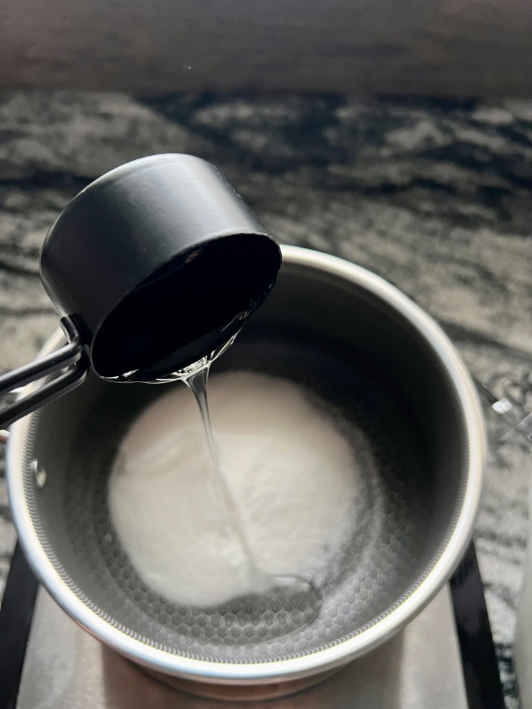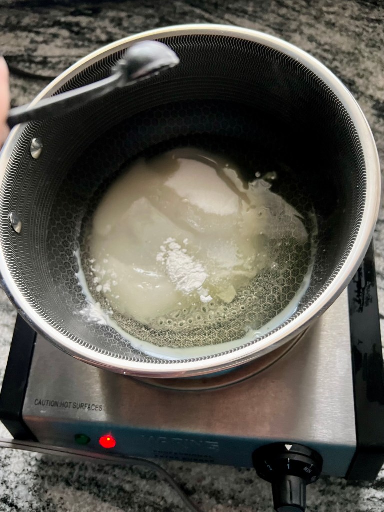 After one minute turn the temperature on the pot down to simmer and continue beating at high speed for the next 7 minutes. Trust the process! For the first few minutes there will be bubbles in the mixture and that is a clear sign it is not done. Then it will turn white and creamy but doesn’t hold its form. Keep going!