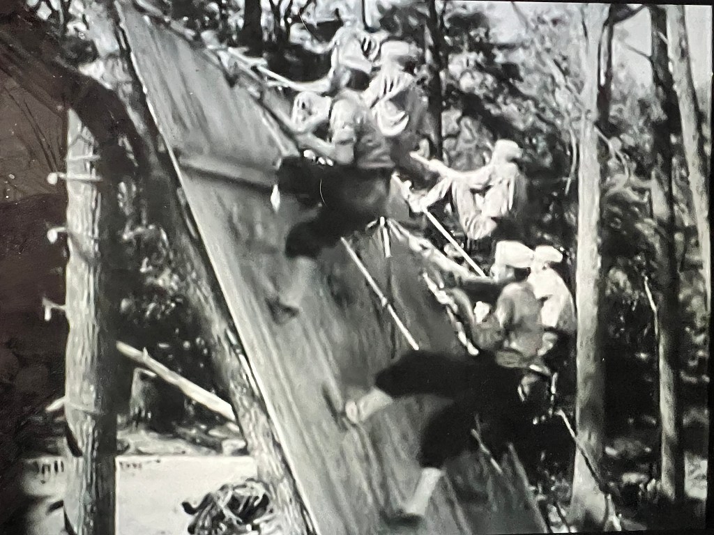 We began taking long hikes through the wooded section of camp and working out military problems under simulated battle conditions. They wanted us in the best physical condition in the shortest time possible. Then came the obstacle course that would test our stamina. We climbed walls, jumped ditches, swinging and climbing ropes, and crawling under barbed wire. It was pretty tough. There were a lot of things I didn’t like about training but I hated KP (kitchen patrol).